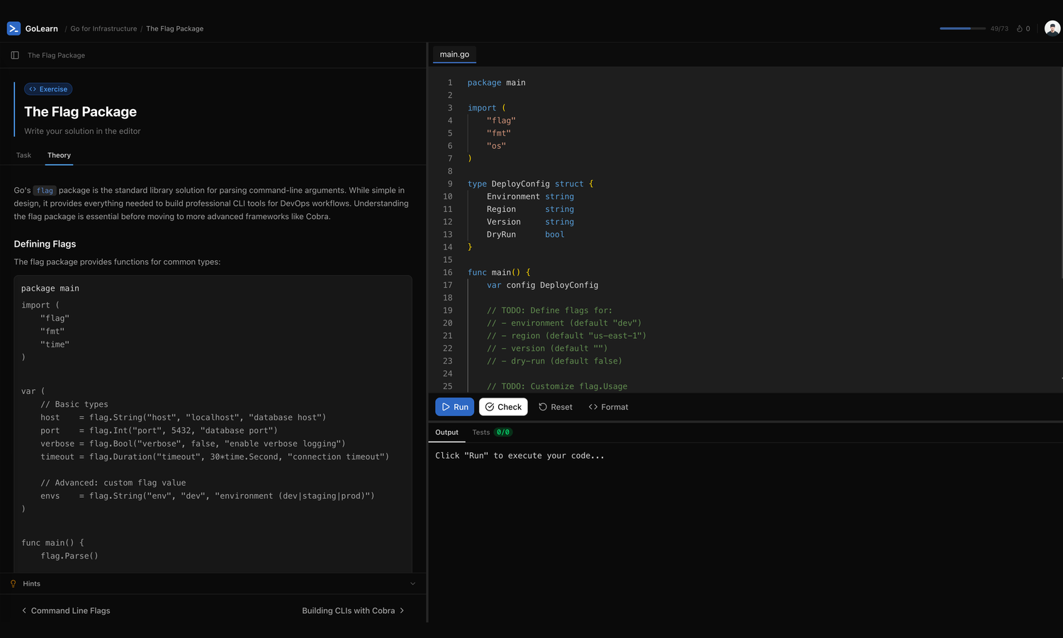 GoLearn is an interactive platform for learning Go. Each lesson is a Monaco editor plus a sandboxed Go runtime — you write code on the left, the output streams back on the right, and exercises verify you understood the concept before letting you move on.
