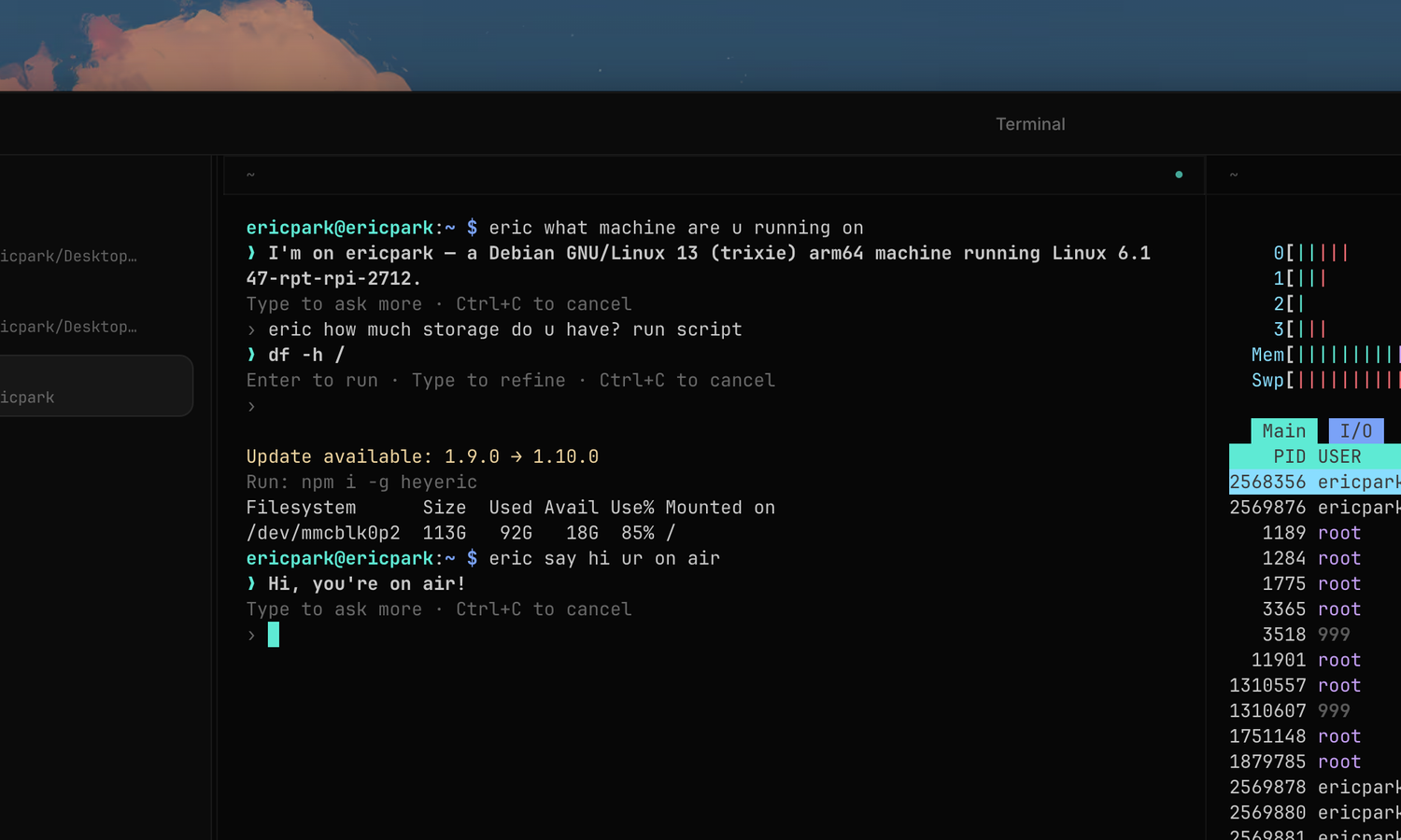 heyeric is a command-line tool that takes plain English and turns it into a bash command you can review and run. "find all markdown files modified in the last week" becomes `find . -name "*.md" -mtime -7`. You confirm, then it executes.