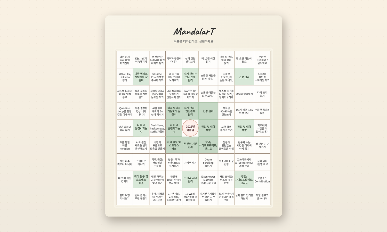 Deployed at mandalart.ericpark.me behind Cloudflare. A small, self-contained tool that does one thing well — which is the version of "shipped" I enjoy most.